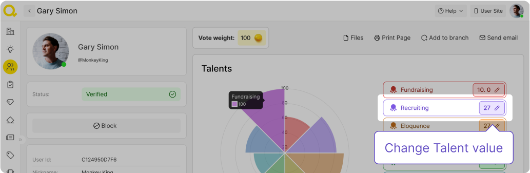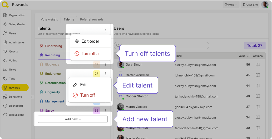 Au début de votre travail avec Qela, vous disposez d'une liste de 8 talents par défaut : collecte de fonds, recrutement, endurance, éloquence,détermination, originalité, gestion et astuce. Vous pouvez continuer à utiliser cette liste, désactiver l'un de ces talents et ajouter les vôtres. Vous pouvez également désactiver complètement le système de talents pour votre communauté, auquel cas ils n'apparaîtront plus dans les profils des membres.