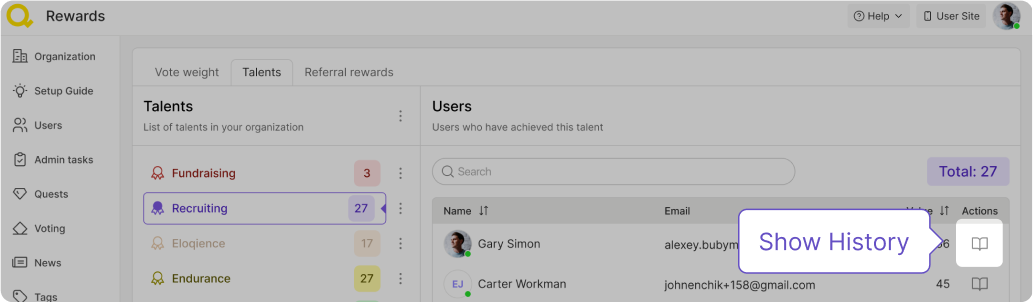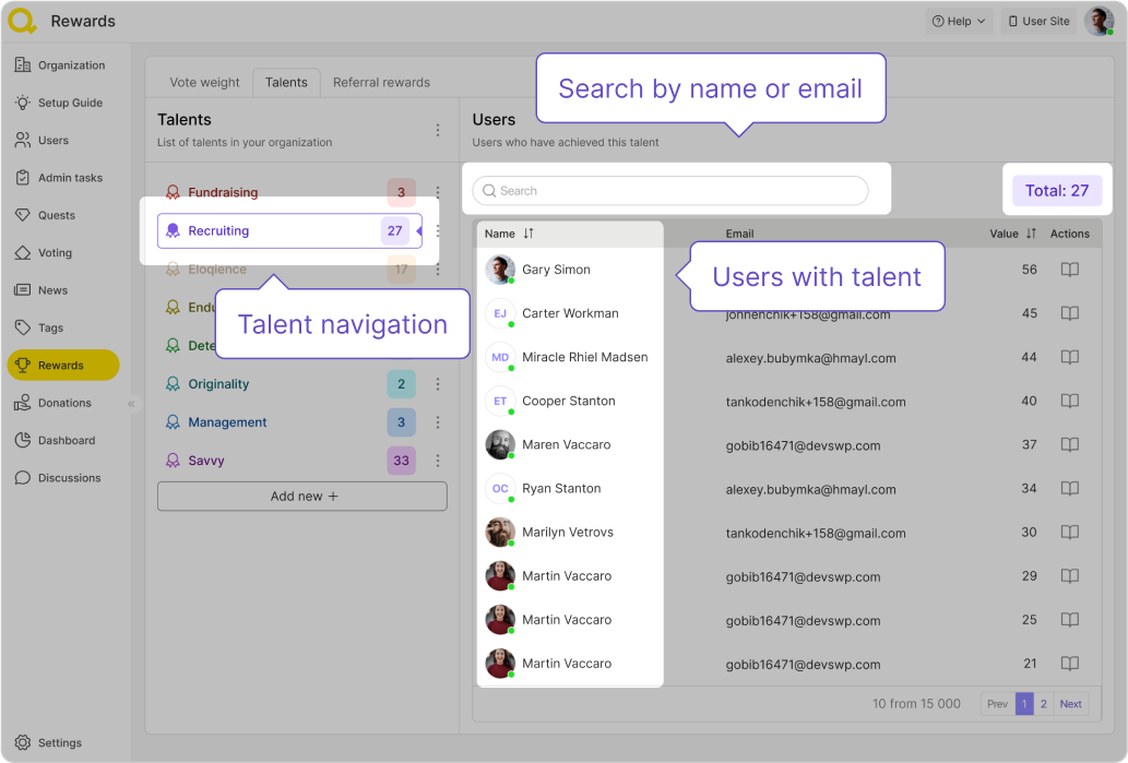 En cliquant sur chaque talent, vous pourrez voir combien de supportersont récemment reçu des points supplémentaires pour cette compétence.Vous pouvez utiliser la barre de recherche pour trouver un membre spécifique de la communauté — utilisez son email pour cela.