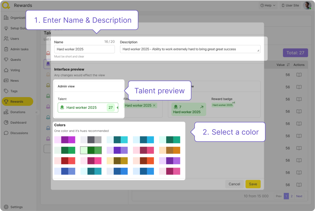 Une fois que vous appuyez sur le bouton Ajouter nouveau, une fenêtre modale apparaîtra, où vous pourrez créer un talent en deux étapes simples: donner un nom et sélectionner une couleur. Vous pouvez également voir les modifications qui ont été apportées.