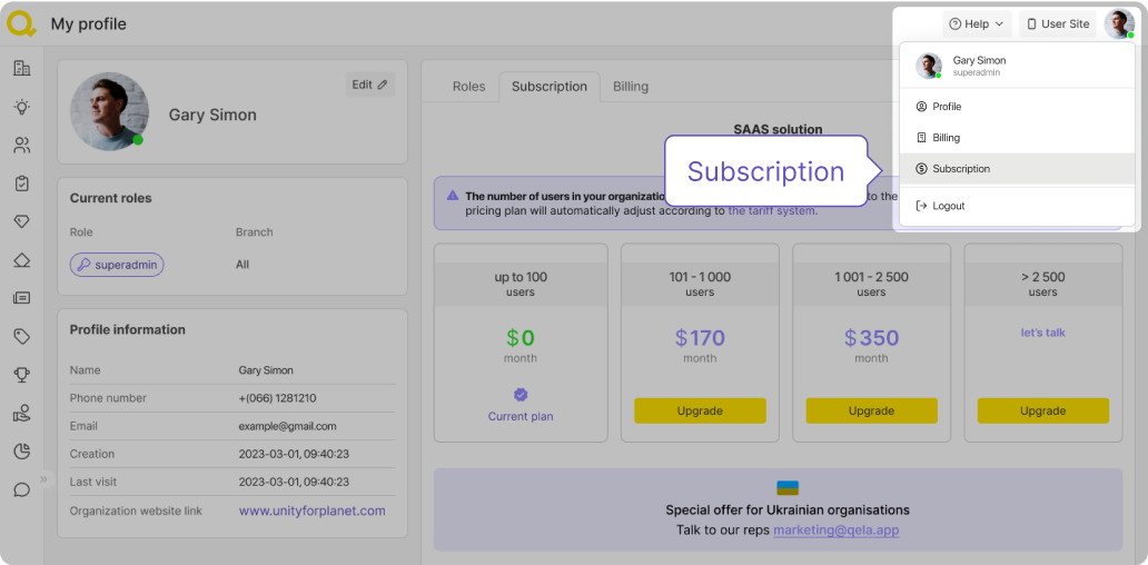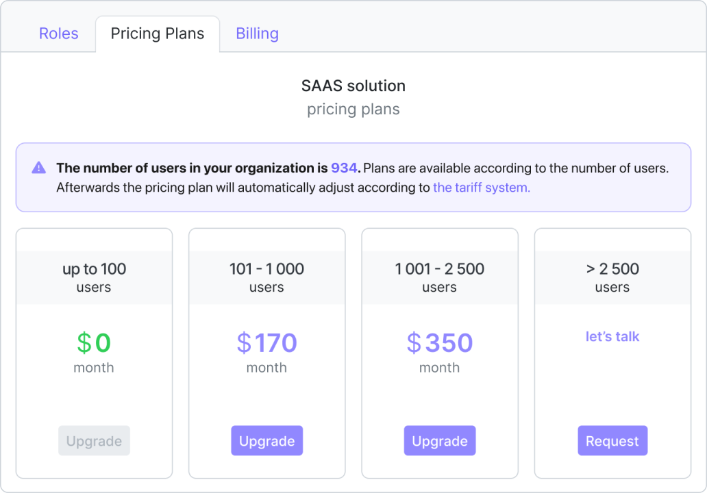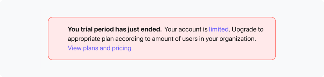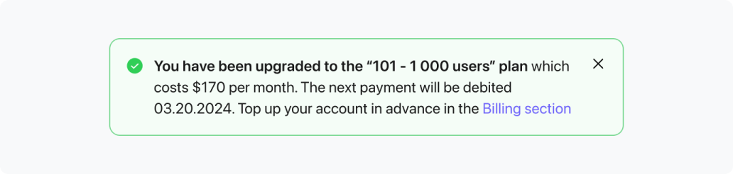 Si le nombre d'utilisateurs dans l'organisation du client dépasse le tarif choisi pendant l'utilisation, il recevra une notification concernant le changement de plan tarifaire, avec des informations sur la prochaine date de débit et l'état actuel du compte.