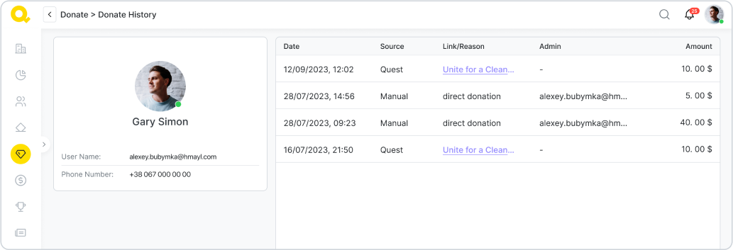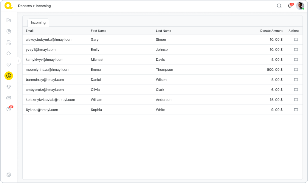 Sur cette page, vous pouvez voir la liste de toutesles donations qui vous ont été envoyées via Qela.Dans le coin supérieur gauche, vous pouvez voir la somme de toutes les donations — le montant total.