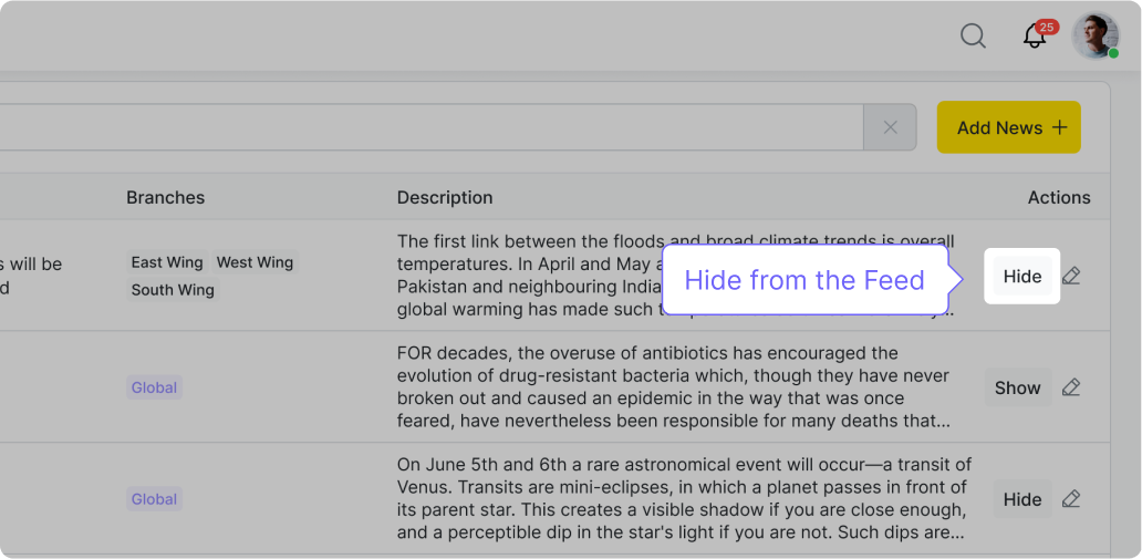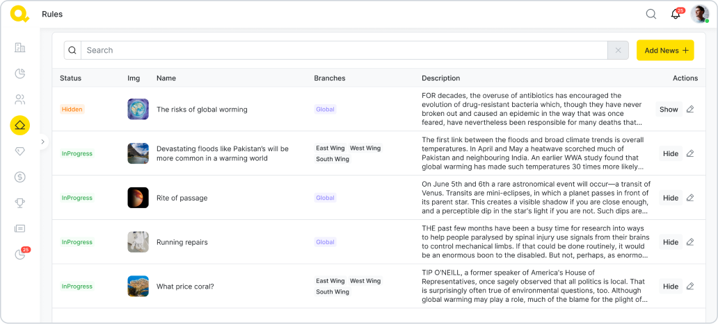 Vous pouvez envoyer des annonces et des actualités à vos participants dans Qela via cette page. Pour trouver un article avec une barre de recherche, tapez des mots-clés ou le nom complet de l'article dans celle-ci.