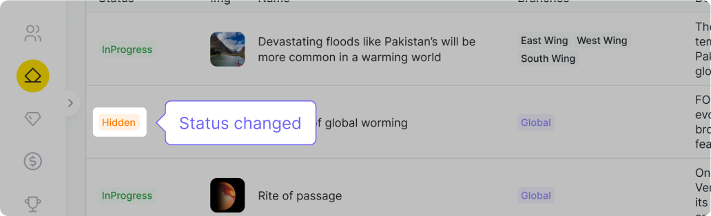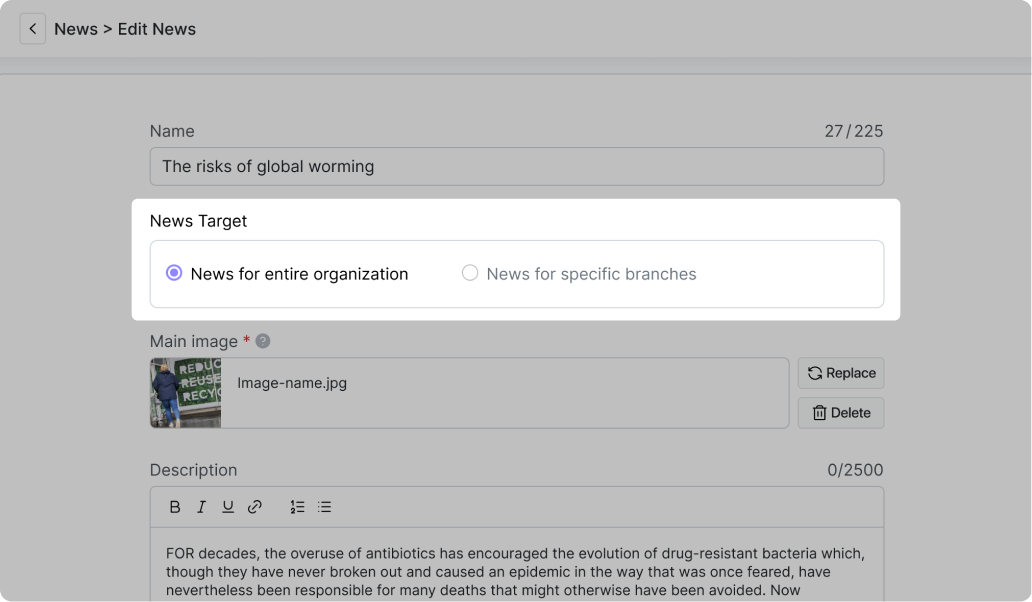 Lors de la création d'une nouvelle, vous pouvez choisir sielle sera montrée à tous les bénévoles ou seulement à ceux liés à une branche spécifique de l'organisation.