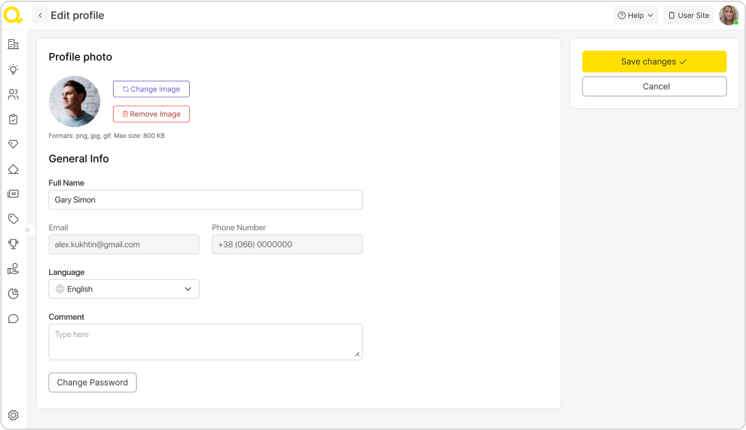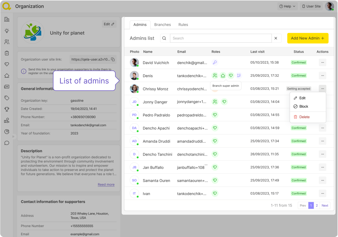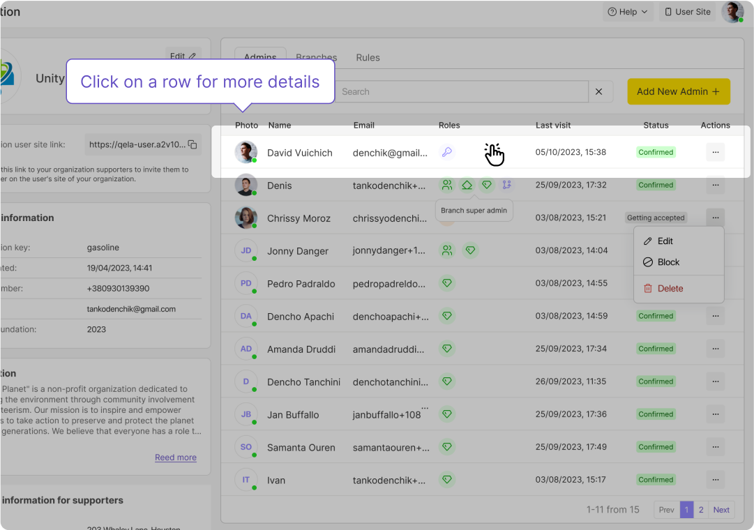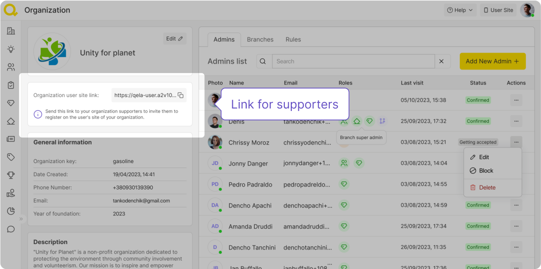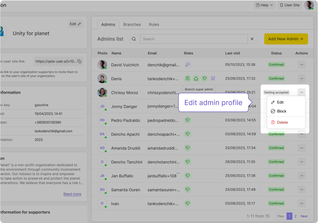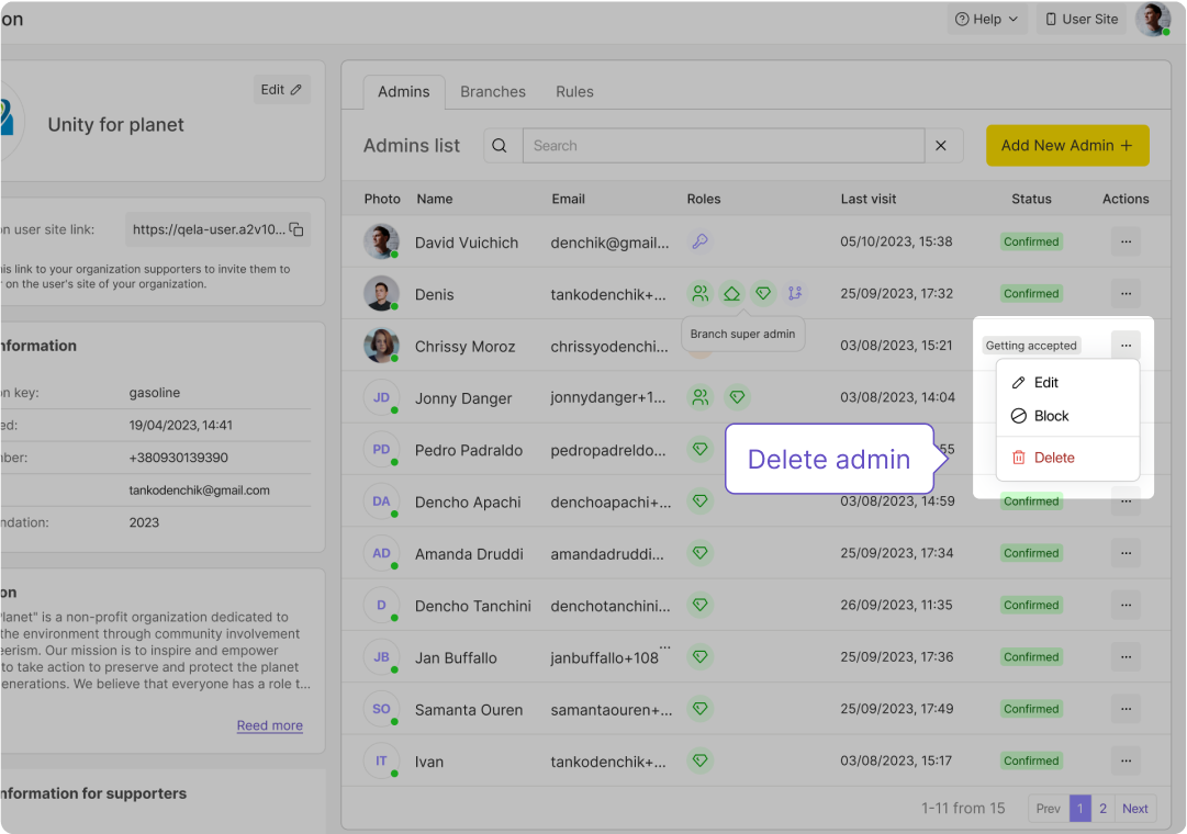 - Supprimer un administrateur Pour ce faire, ouvrez le profil d’un administrateur spécifique, cliquez sur « Supprimer » et confirmez l’action dans la fenêtre contextuelle. Exemple : une erreur a été commise dans l’adresse e-mail lors de l’inscription de l’administrateur.