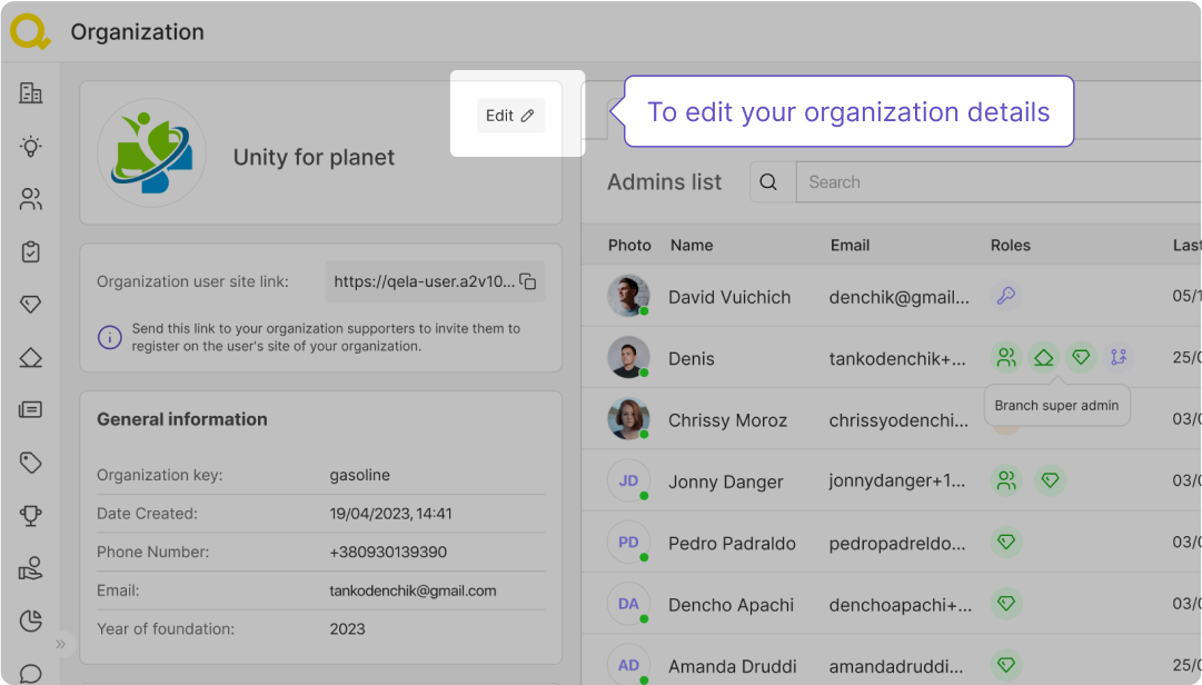 Vous pouvez modifier les informations principales de votre organisation à tout moment en cliquant sur le bouton « Modifier » sous le nom de votre organisation.