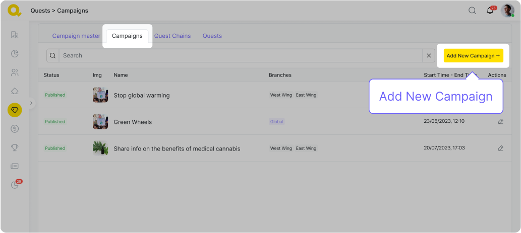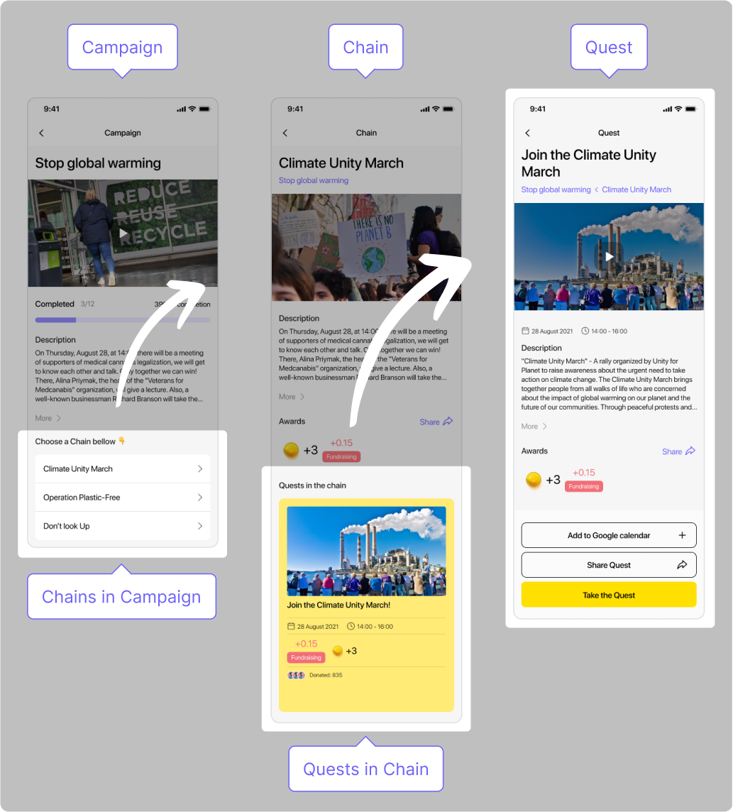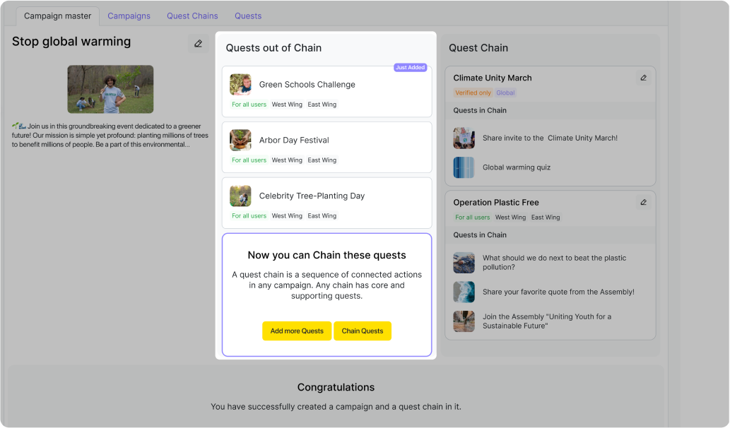 Le fonctionnement est le suivant. Les grands objectifs qu’une organisation souhaite atteindre servent de base à la création de campagnes. Celles-ci sont ensuite découpées en étapes plus petites, appelées chaînes, et remplies de quêtes — c’est-à-dire d’actions simples et accessibles que les participants peuvent entreprendre pour aider l’organisation à atteindre ses buts.