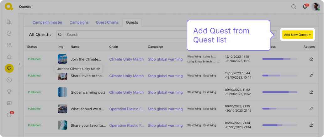 Vous pouvez créer des quêtes en cliquant sur le bouton « Créer une nouvelle quête ».