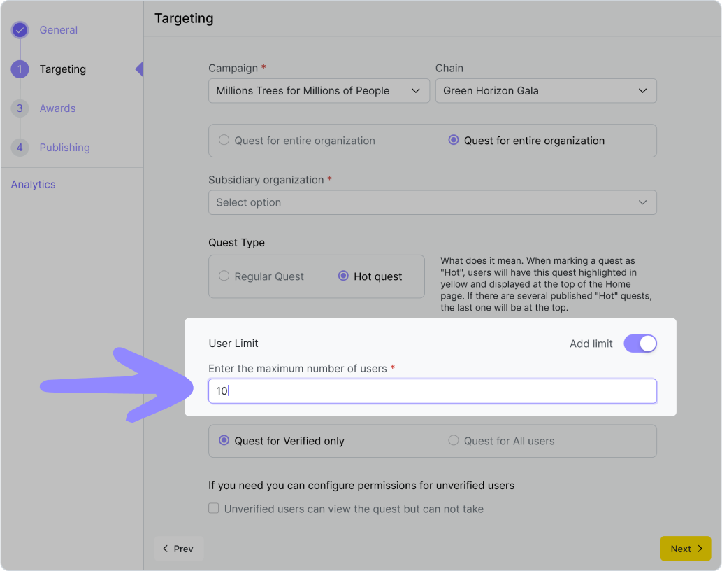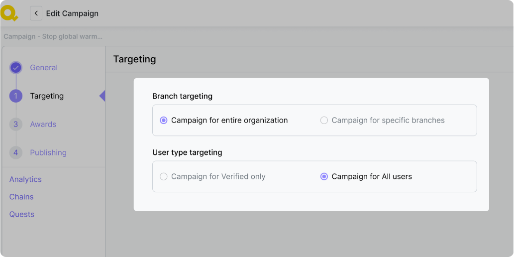 Vous pouvez cibler toute l’organisation, certaines branches, tous les utilisateurs, ou uniquement les utilisateurs vérifiés. Les chaînes et quêtes d’une campagne suivent automatiquement le même ciblage que la campagne principale.