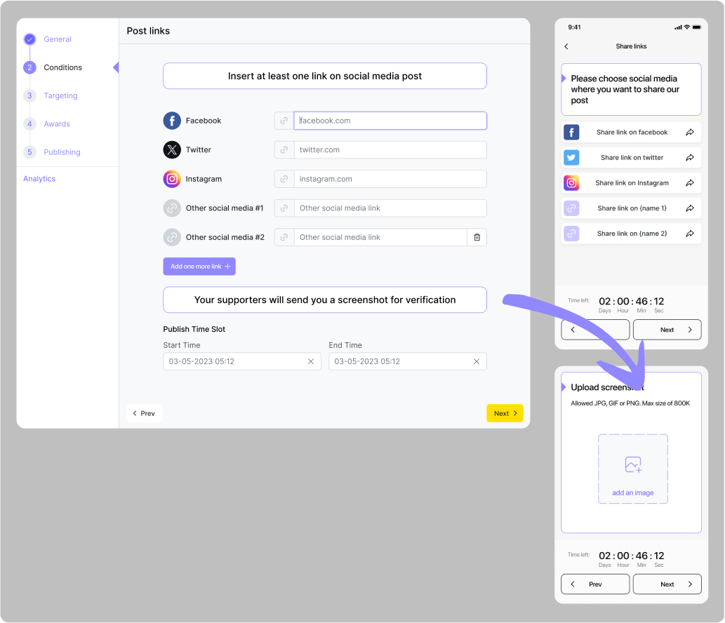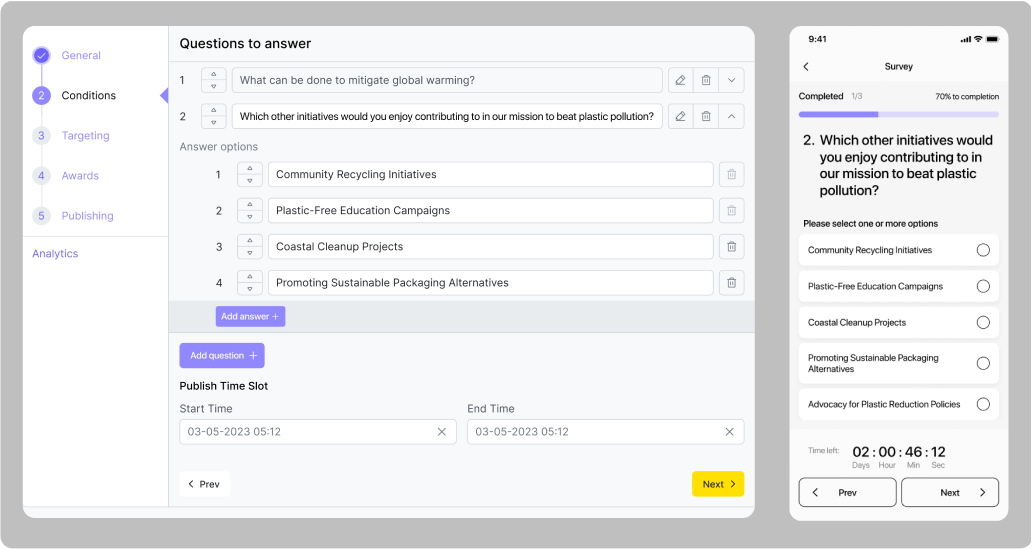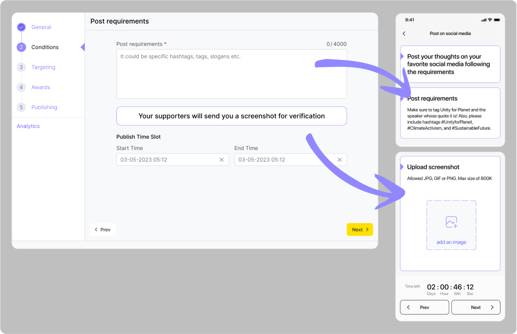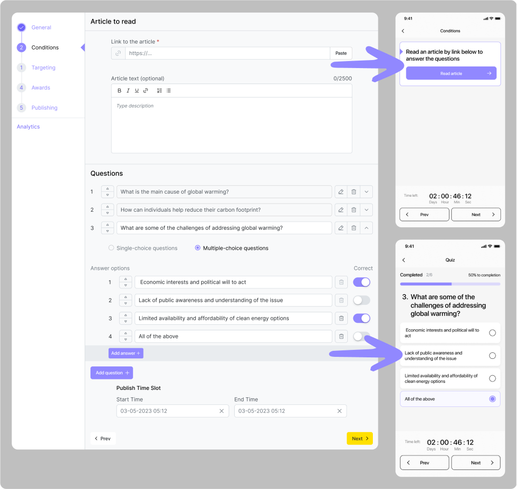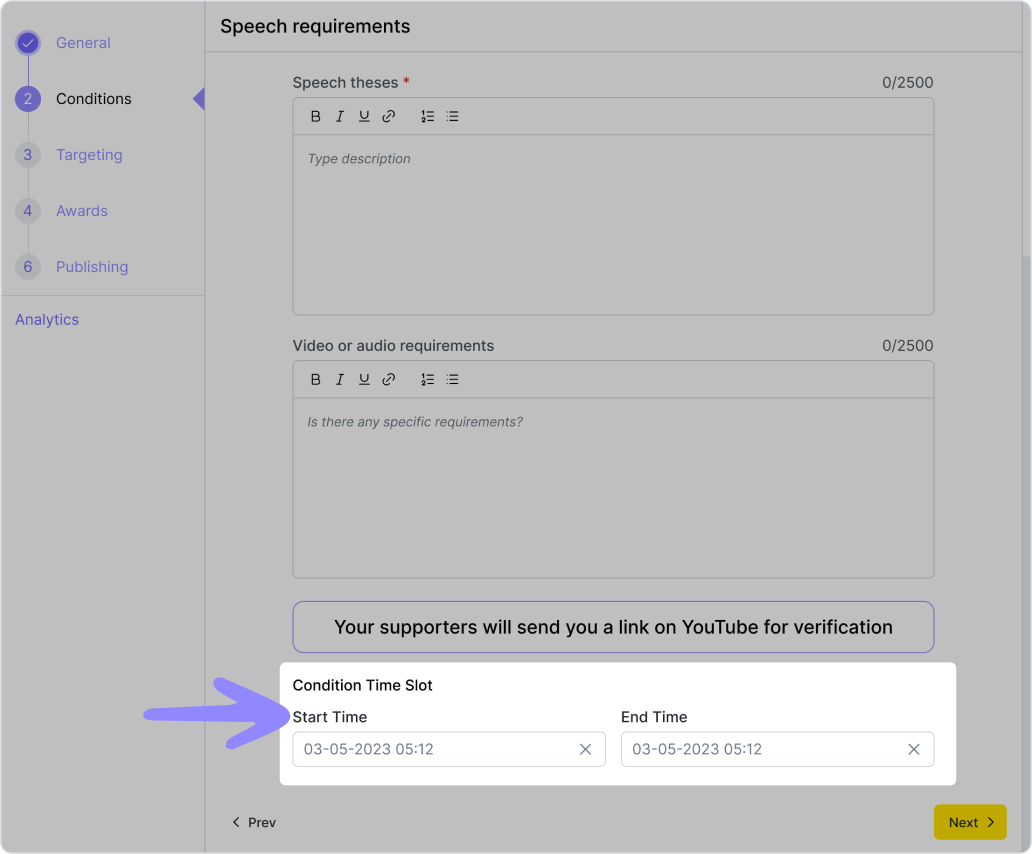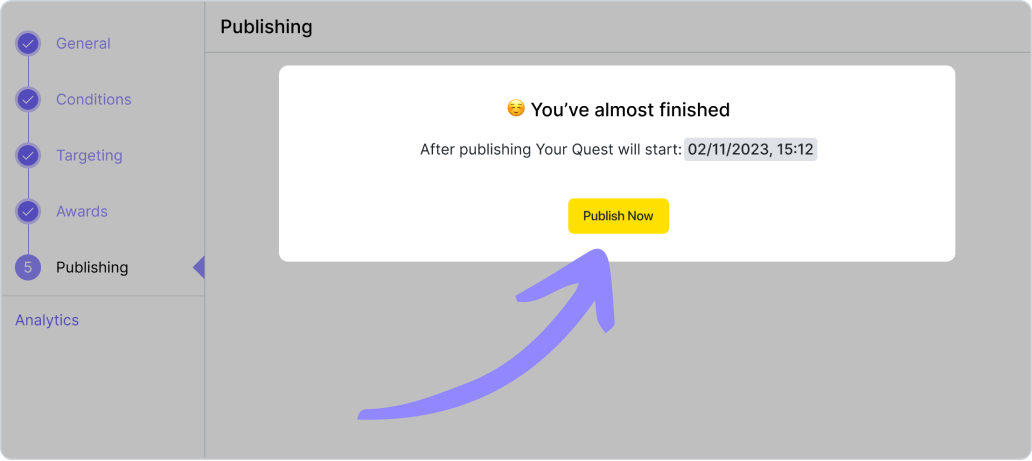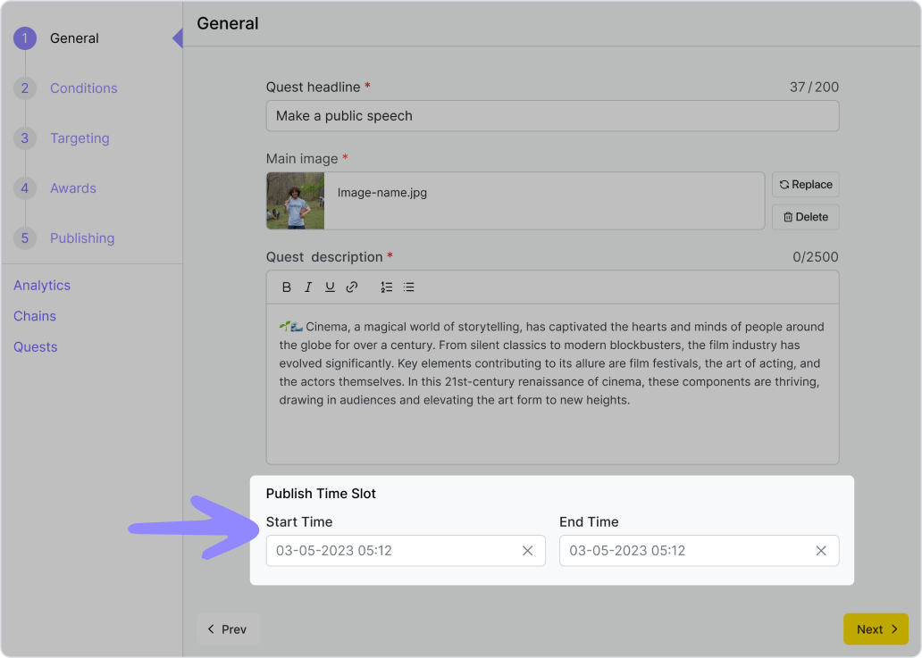 Le créneau de publication est un intervalle de temps qui détermine pendant combien de temps la quête sera affichée dans l'application pour les utilisateurs. On peut définir les paramètres des conditions lors de la création d'une quête. Il ne peut pas se terminer avant le créneau horaire de la condition.