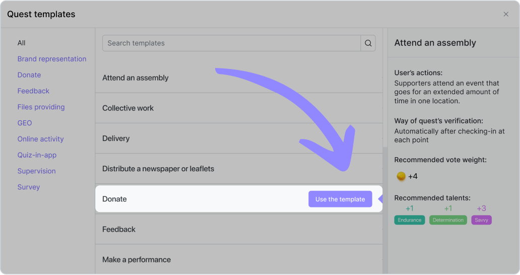 - Créer une quête. Allez dans le menu des quêtes et sélectionnez le modèle « Faire un don ».