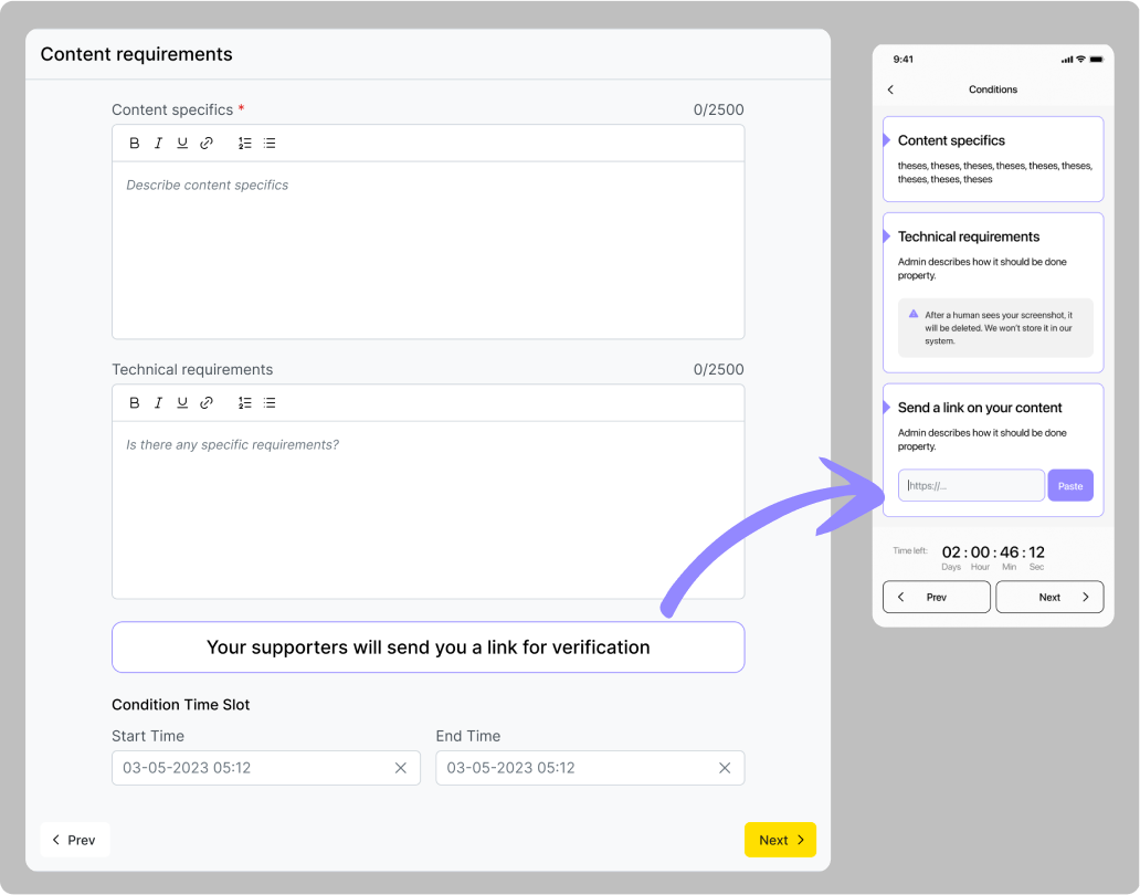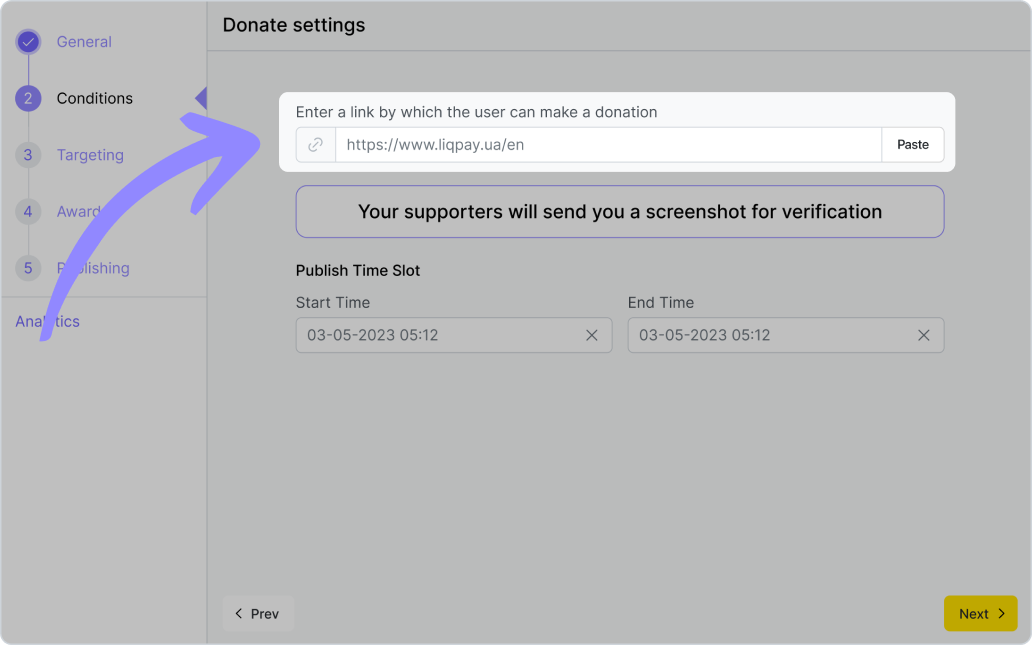 Dans l’onglet « Conditions », vous devez indiquer le lien vers le système de paiement par lequel votre organisation collecte les fonds. C’est également ici que la condition d’accomplissement de la quête est précisée : l’utilisateur doit envoyer une capture d’écran d’une transaction réussie (ou une photo d’un chèque bancaire) avant l’heure que vous avez spécifiée, afin de confirmer son don.