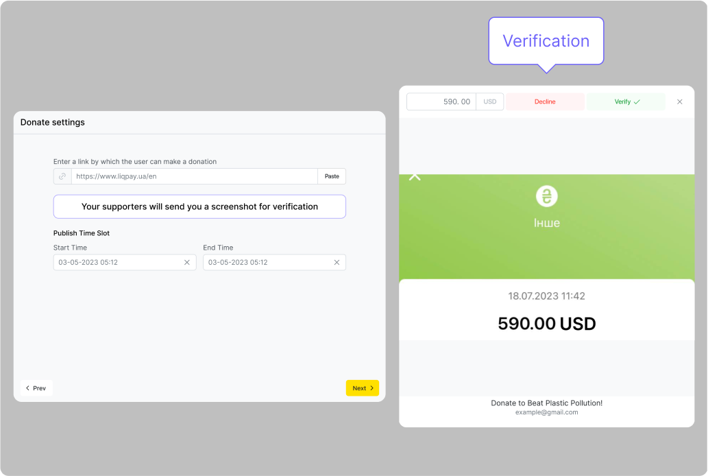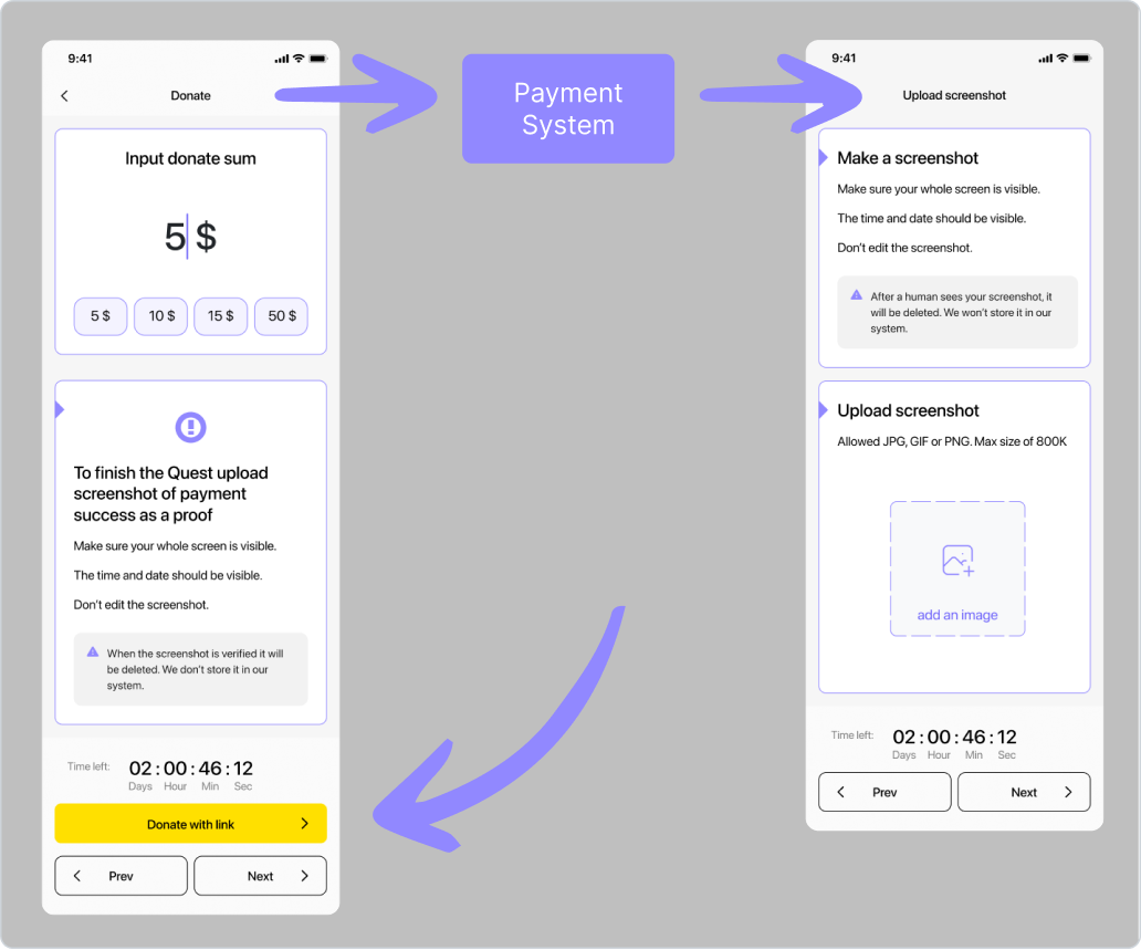 Après avoir cliqué sur « Relever la quête », un utilisateur accède à l’écran d’exécution de la quête. Sur celui-ci, il peut choisir le montant requis et les conditions qui doivent être remplies pour que la quête soit considérée comme accomplie. En cliquant sur le bouton « Faire un don via le lien », l’utilisateur est redirigé vers la page du système de paiement, où il transfère les fonds. Après avoir cliqué sur Suivant, l’utilisateur accède à l’écran de réalisation de la condition — le téléversement d’une photo d’une opération de transfert de fonds réussie.