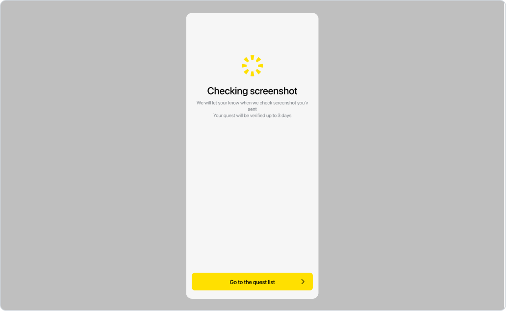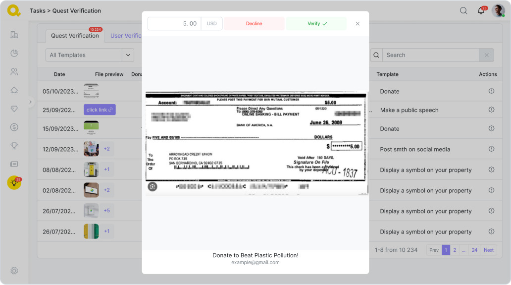 Vous verrez la capture d'écran envoyée par l'utilisateur, avec les actions suivantes : Saisir le montant d'argent indiqué sur le chèque; Rejeter la vérification — par exemple, si l'utilisateur a soumis une image floue ou inappropriée. Dans ce cas, l'utilisateur recevra une notification indiquant qu'il doit répéter la tentative de vérification. Confirmer la vérification —dans ce cas, l'utilisateur recevra une notification indiquant que la capture d'écran a été vérifiée et que la quête a été créditée.