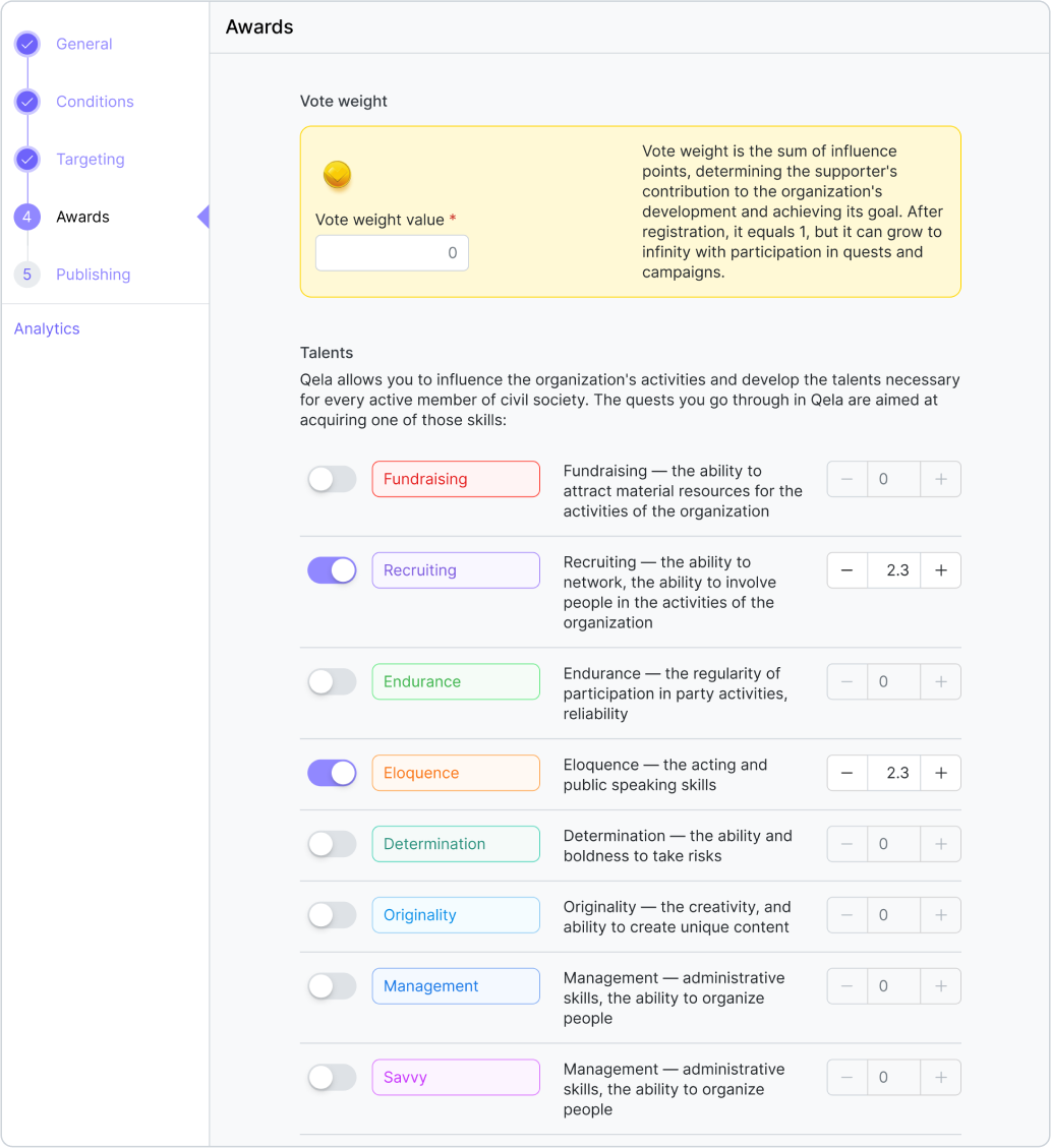 Compléter une quête doit donner à un participant des points de Poids de Vote et développer certains de ses talents de LIBERTÉS. Nous avons des suggestions sur le nombre de points que chaque quête peut attribuer, mais vous pouvez modifier ce nombre comme vous le souhaitez dans la section« Récompenses » de la création de quête. Le nombre maximum de points pour chaque talent qu'une personne peut obtenir est de 1000. Cependant, nous incluons une limitation spéciale pour empêcher l'accumulation d'un grand nombre de points entre les mains de quelques personnes et aussi pour stimuler les participants actifs à rester engagés. Après qu'un participant ait acquis 250 points pour un talent, il n'obtiendra que 75% des points de talent indiqués dans une quête qu'il entreprend. Après avoir acquis 500 points, ils n'obtiendront que 50 % des points indiqués dans la quête, et seulement 25 % après avoir atteint 750 points de talent.