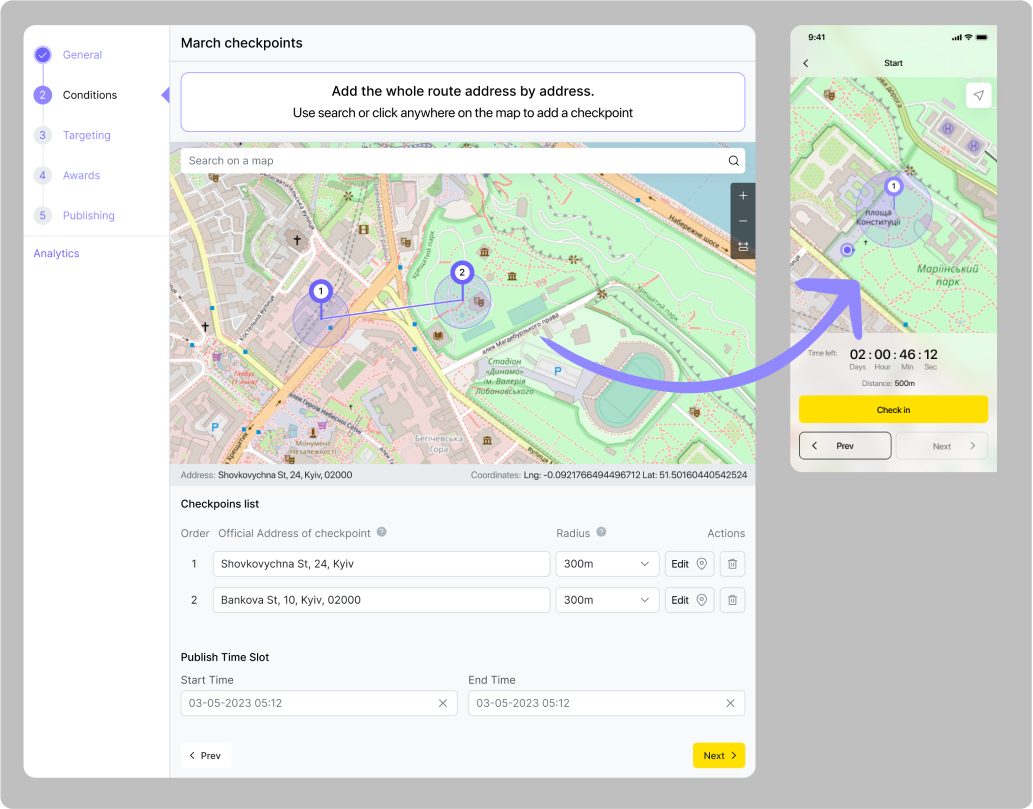 Exemple : L'organisation a décidé d'organiser une manifestation qui durera deux heures à partir de midi le 15.06.2024 à l'adresse Khreshchatyk 36.L'administrateur de l'organisation crée une géo-quête dans laquelle il indique l'adresse et remplit tous les champs nécessaires de la description, y compris "plage horaire de condition". Cette période devrait commencer vers 11h30 le 15/06/2024 afin que les participants puissent commencer à compléter la quête un peu plus tôt que le début de l'événement, et se terminer le 15/06/2024 à 14h00. Pour que les utilisateurs aient l'opportunité de se renseigner sur l'événement à l'avance, le "Créneau de publication" devrait commencer une semaine avant l'événement, vers midi le 08.06.2024, et se terminer le 15.06.2024 à 14h00. Ainsi, les utilisateurs pourront voir cette quête une semaine avant la manifestation, mais ne pourront commencer à la compléter qu'une demi-heure avant le début de celle-ci.