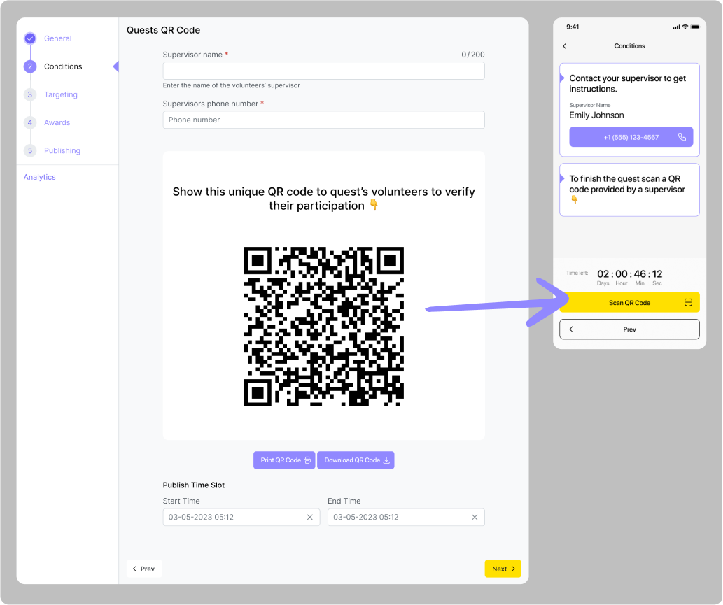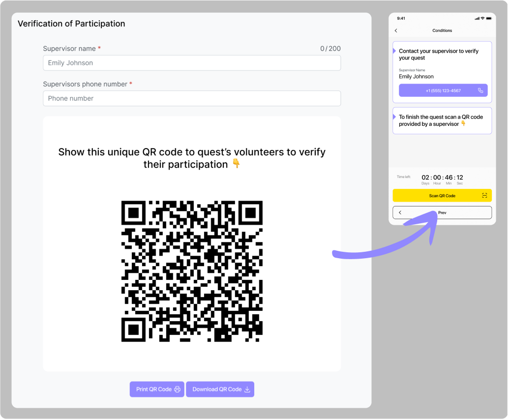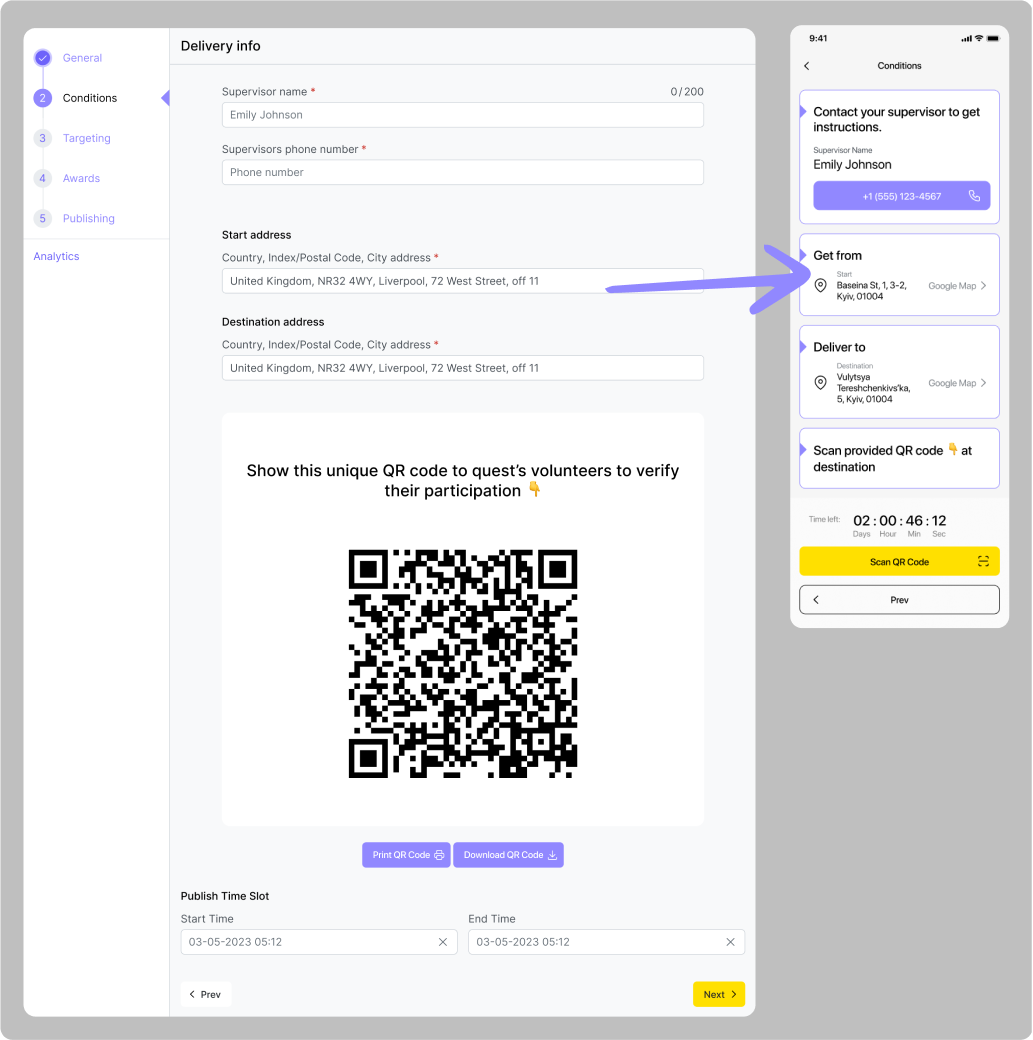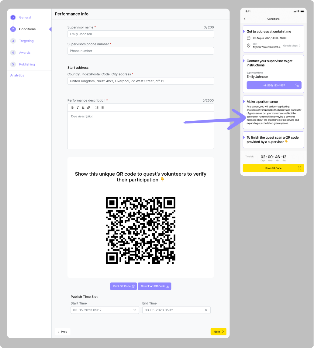 Cette quête nécessite également une géoconfirmation, mais en plus de cela, les participants devront également scanner un code QR auprès d'un superviseur après avoir distribué tous les matériaux nécessaires. Pour cela,vous devrez non seulement ajouter l'adresse d'un lieu pour la quête, mais aussi les contacts d'un superviseur.