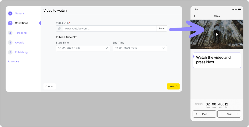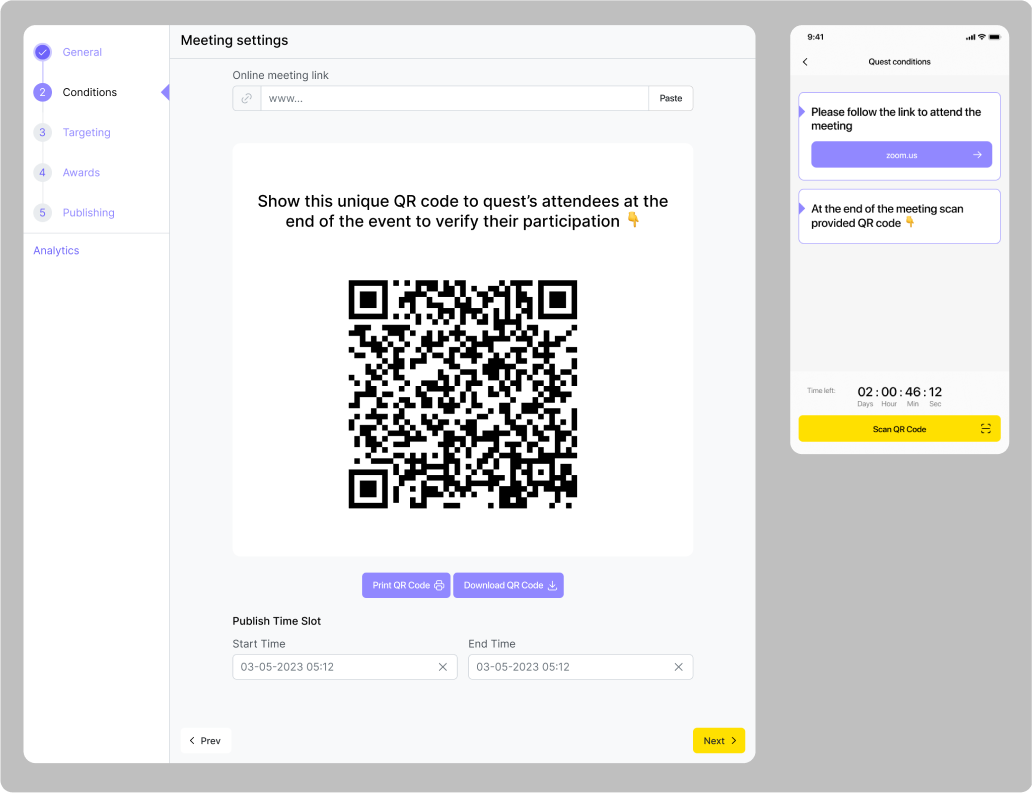 Le créneau horaire de condition est le moment où les utilisateurs ont l'opportunité de terminer la quête. Il est défini dans les paramètres principaux de la quête et ne peut pas être plus long que le créneau de publication.