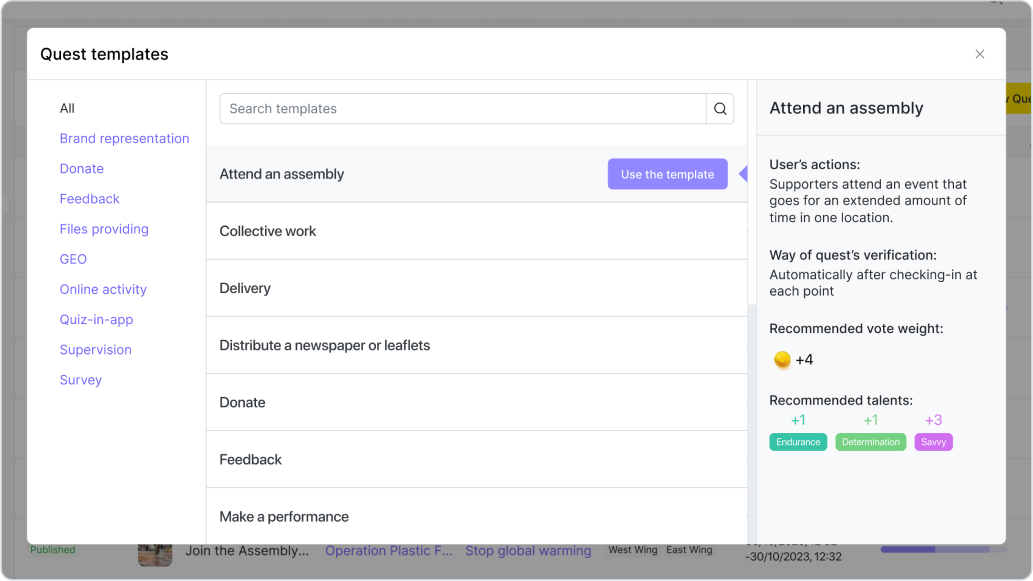 La fonctionnalité principale de Qela repose sur les quêtes et les campagnes, qui correspondent aux actions utiles qu’un volontaire peut accomplir pour une organisation — qu’il s’agisse de signer une pétition ou d’organiser un événement local. Nous proposons 18 modèles d’activités différentes que vous pouvez adapter à vos besoins.