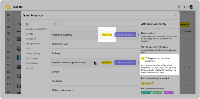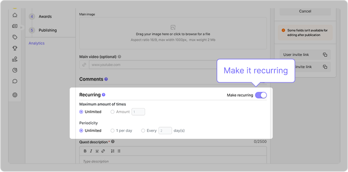 vous pouvez permettre à vos participants d’effectuer une quête une seule fois ou de la rendre récurrente. Vous pouvez choisir combien de fois et à quelle fréquence la quête peut être réalisée.