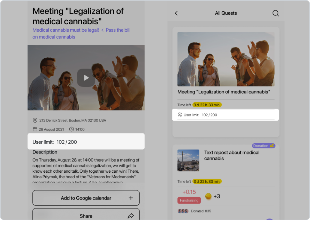 Vos participants voient ces changements ainsi : dans la liste des quêtes disponibles, les utilisateurs peuvent voir combien de personnes les ont déjà prises et le nombre maximum de participants pour chacune des quêtes.