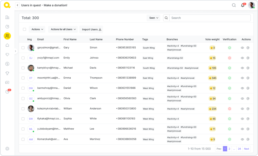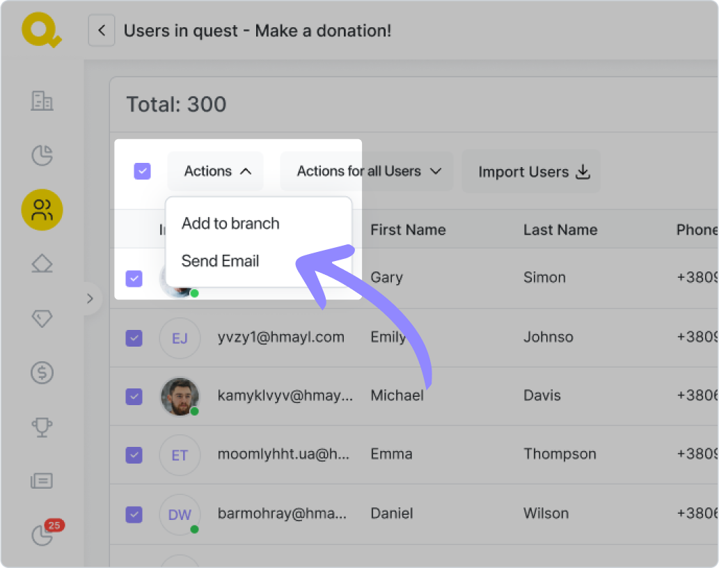 Si vous avez besoin de contacter les utilisateurs participant à la quête, vouspouvez voir des informations à leur sujet dans l'onglet "Analytique" de lapage d'édition de la quête. Dans l'onglet « Pris », vous verrez tous ceux quise sont inscrits à la quête, vous pouvez leur écrire un email facilement enutilisant le bouton « Envoyer un email ».