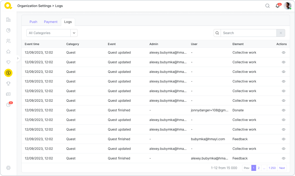 La plupart de cette page est encore en construction. Mais vous pouvez déjà utiliser le menu Logs pour suivre tous les changements et mises à jour effectués par les administrateurs de votre organisation dans Qela.
